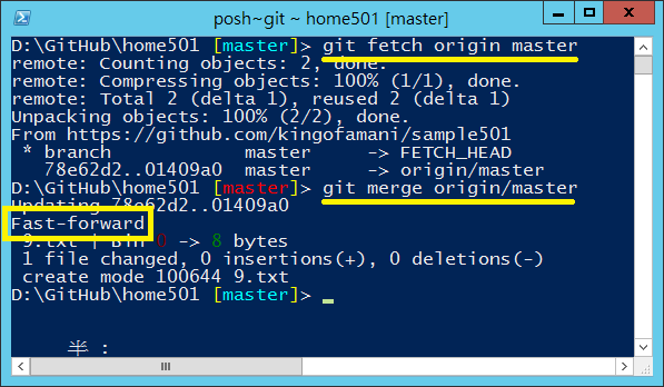 接著我們要做合併動作git merge origin/master由於master和origin/master並沒有分叉,想當然爾這是一個快轉合併囉!